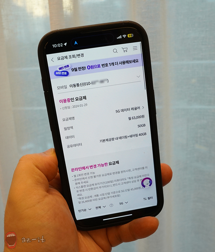 요금제 조회/ 변경 메뉴를 클릭해보았습니다. 현재 이용 중인 요금제 신청일을 시작으로 요금제명/ 월정액/ 제공되는 데이터와 공유 데이터 내용까지 한눈에 확인할 수 있었는데요, 요금제 명을 클릭하면 선택 가능한 다른 요금제와 비교하고 바로 변경도 가능해 편리했습니다.
