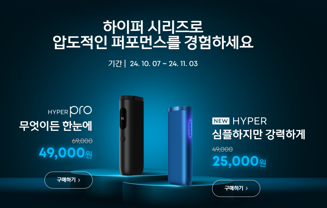 11월 3일까지 진행되는 이번 이벤트는 글로 하이퍼 프로와 글로 하이퍼가 할인 대상에 포함되며,  하이퍼 프로는 49,000원, 하이퍼는 25,000원이라는 파격적인 금액으로 구입할 수 있습니다. 두 제품 중 어느 제품을 선택할지 고민된다면 이벤트 페이지 하단 제품 비교를 통해 내가 원하는 조건에 부합되는 디바이스를 확인해 보는 걸 추천드립니다.