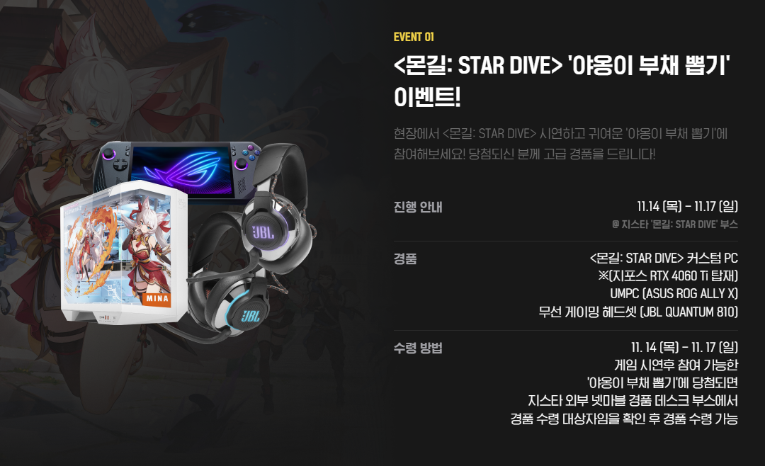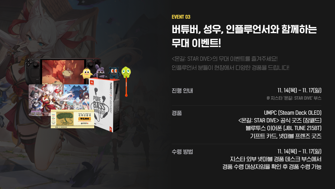몬길: STAR DIVE 게임 이벤트도 놓칠 수 없는데요, 현장에서 시연 후 참여 가능한 야옹이 부채 뽑기 이벤트부터 버튜버, 성우, 인플루언서와 함께 하는 무대이벤트까지 다채롭게 준비되어 있습니다. 특히 무대 이벤트는 이세돌 멤버인 릴파, 징버거, 고세구가 참여해 특별한 시간을 가질 수 있는 만큼 무대도 즐기고 선물도 챙겨보세요!