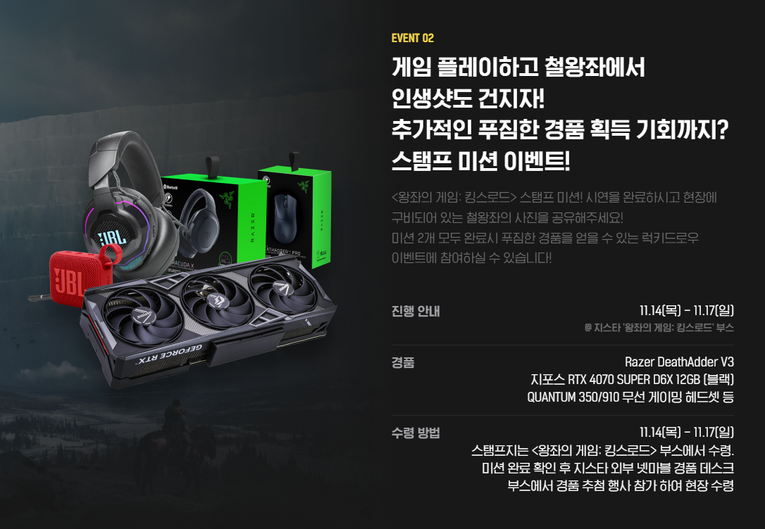 넷마블 부스에서 참여 가능한 게임 이벤트도 놓칠 수 없습니다. 왕좌의 게임: 킹스로드는 선착순 시연 이벤트와 스탬프 미션 이벤트 그리고 무대이벤트가 준비되어 있는데요, 참여한 분들에게는 왕좌의 게임 공식 굿즈를 비롯해 무선 게이밍 헤드셋, 지포스 RTX 4070 SUPER D6X 12GB 등 푸짐한 선물을 받을 수 있는 기회가 주어집니다.