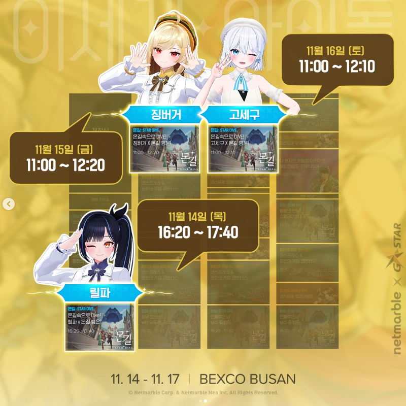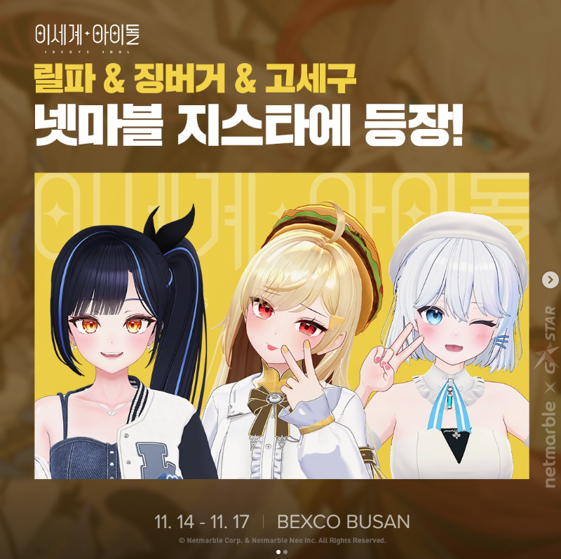 이세계아이돌 멤버인 릴파, 징버거, 고세구의 경우 11월 14일부터 16일에 진행되는 몬길: STAR DIVE 행사 일정으로 참여한다고 하니 이세돌 팬이라면 해당 행사일정은 꼭 챙겨 참여해 보시길 추천드립니다.