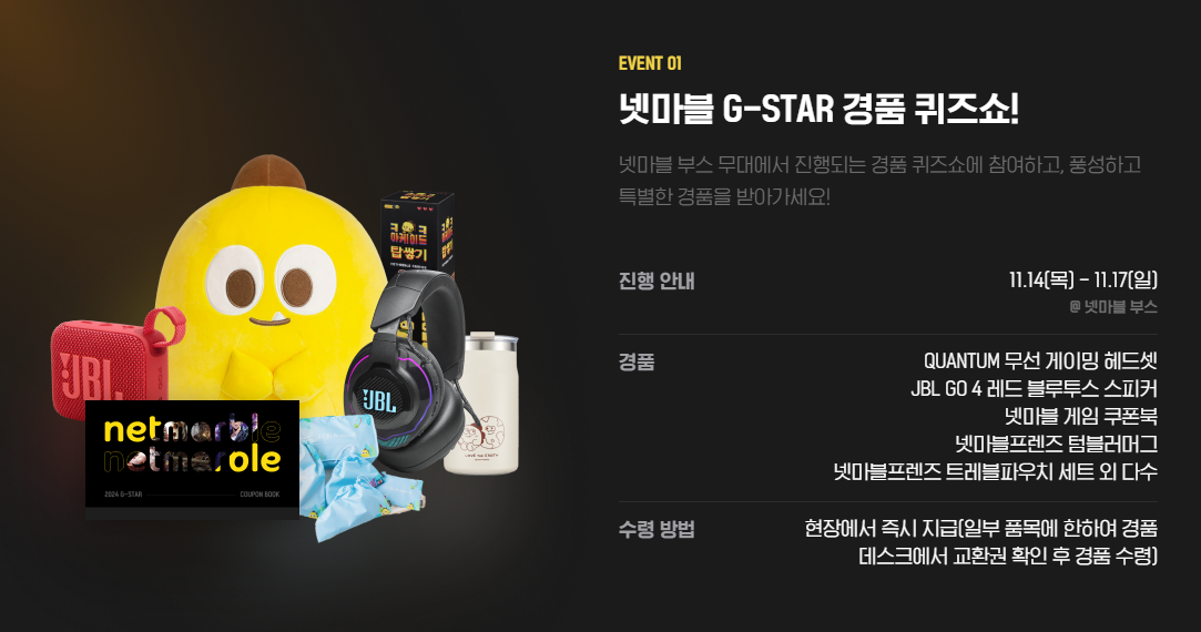 현장에서 진행되는 이벤트도 다양하게 준비되어 있습니다. 11월 14일부터 17일까지 넷마블 부스 무대에서는 넷마블 G-STAR 경품 퀴즈쇼가 진행되는데요, 참여한 분들에게는 넷마블 게임 쿠폰북을 비롯해 넷마블프렌즈 텀블러 머그 등 다양한 경품을 수령할 수 있습니다.
