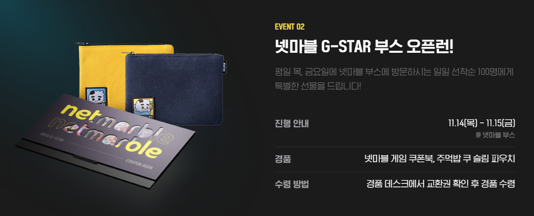 지스타 2024 행사가 시작되면 무조건 넷마블 부스부터 뛰어가야 하는 이유! 바로 11월 14일 목요일과 15일 금요일 양일간 오픈런 이벤트가 진행되기 때문입니다. 일일 선착순 100명에게는 넷마블 게임 쿠폰북과 주먹밥 쿠 슬림 파우치를 선물로 증정하는데요, 누구보다 빨리 신작도 만나고 선물도 수령하는 일석이조의 즐거움을 누려볼 수 있습니다.