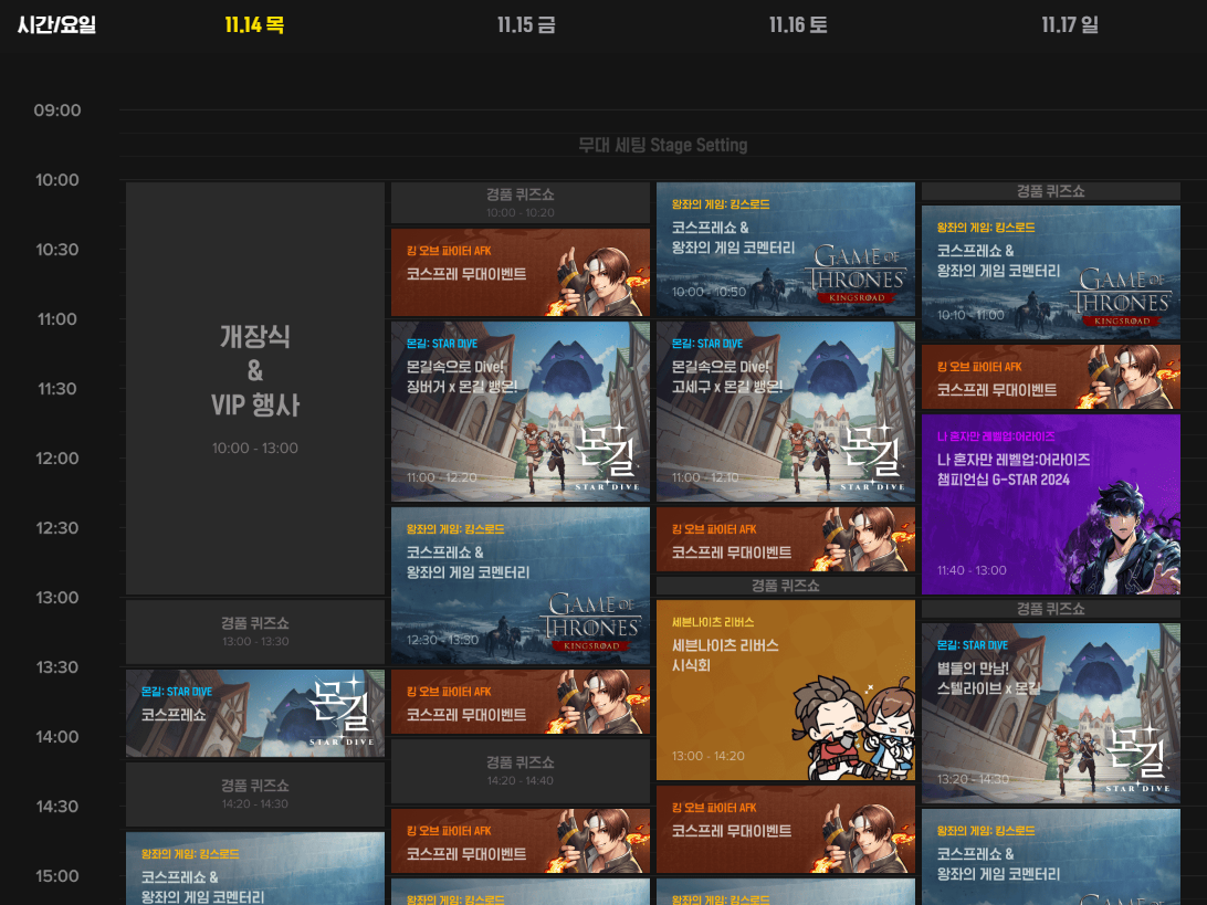 지스타 2024가 진행되는 동안 넷마블 부스에서는 몬길: STAR DIVE과 왕좌의 게임: 킹스로드 시연존 외에 다양한 행사가 풍성하게 준비되어 있습니다. 행사 첫날 몬길: STAR DIVE 코스프레쇼를 시작으로 킹 오브 파이터 AFK 코스프레 무대이벤트, 왕좌의 게임: 킹스로드 코스프레쇼 등 시간대별 다양한 행사 참여가 가능합니다.
