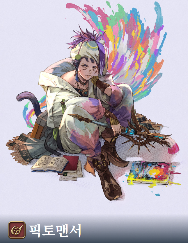 픽토맨서는 지팡이 대신 붓처럼 생긴 마법도구를 손에 들고 그림 마법을 사용합니다. 마력의 물감으로 허공에 그린 생물이나 무기, 심지어 풍경까지도 현실로 구현하는 특징을 가지고 있습니다. 그림을 그려야 하는 만큼 시전 시간이 필요하지만, 즉시 시전 마법과 능력을 보유하고 있어 기대되는 직업이기도 합니다.