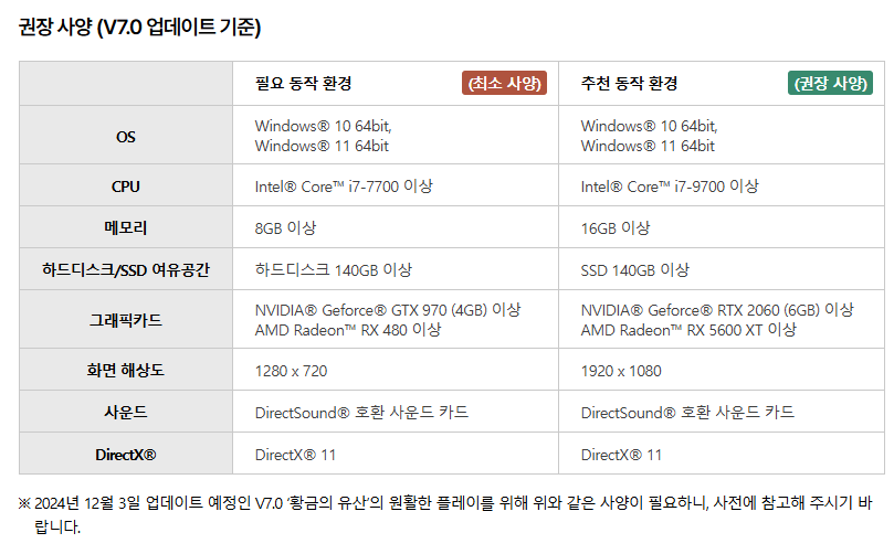 7.0 황금의 유산 업데이트 기준 PC 권장사양의 경우 최소사양 기준으로 메모리와 저장장치 그리고 그래픽카드 성능이 기존보다 올라간 점이 특징입니다. CPU를 고려해 사양이 너무 낮다면 이번 기회에 전반적인 PC사양을 업그레이드하는 것도 좋을 것 같은데요, 그래픽 카드의 경우 RTX3060이나 3060 Ti로도 충분하니 현재 사용 중인 PC 기준으로 전체적인 사양을 점검해 보고 업그레이드를 진행하는 걸 추천드립니다.