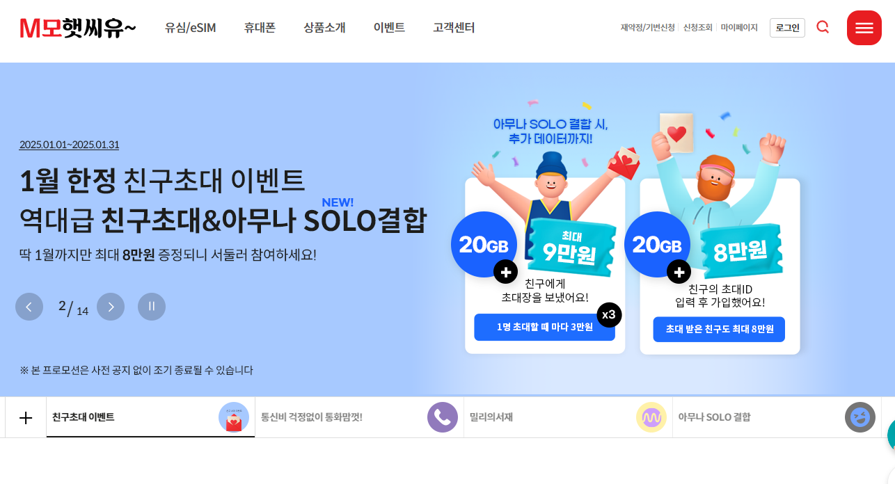 아무나 SOLO 결합 혜택도 그냥 지나칠 수 없는데요, 아무나 찾지 않아도 혼자서 결합하면 최대 20GB 데이터를 받을 수 있는 혜택입니다. 런칭 기념 2행시 댓글을 달고 아무나 SOLO 결합하면 누가나 네이버페이 3만 원도 증정하는데요, kt M모바일 신규 고객이라면 누구나 받을 수 있는 혜택인 만큼 놓치지 마시길 바랍니다.