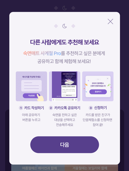 참고로 나비엔 숙면매트 사계절 Pro 체험단에 당첨될 확률을 높이고 싶다면 친구에게 체험단을 추천해 주세요. 체험단 페이지에서 공유하기 버튼을 눌러 숙면을 전하고 싶은 친구에게 카카오톡으로 공유하면 완료됩니다. 카드를 받은 친구가 단꿈체험소를 통해 신청하면 당첨 확률은 더욱 높아지겠죠?