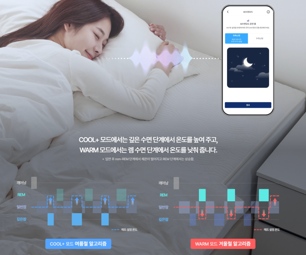 무엇보다 마음에 쏙 드는 기능은 계절에 맞춰 AI가 수면을 케어해 준다는 점인데요, 스마트폰을 통해 수면 중 호흡을 듣고 분석해 수면 단계를 측정하고 단계에 맞는 최적 온도를 제공한다는 점입니다. AI 수면모드로 선택하면 계절의 변화에도 편안한 수면을 할 수 있는 최적의 환경을 만들어 주는데요, 사용자 맞춤형으로 최적화된 숙면을 취할 수 있어 더 이상 밤에 뒤척일 필요가 없을 듯합니다.