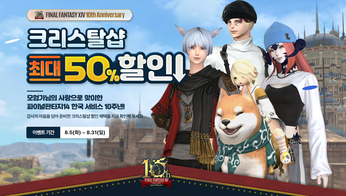파이널판타지14 10주년을 기념한 또 하나의 선물. 바로 크리스탈샵 최대 50% 할인 이벤트입니다. 8월 31일까지 진행되는 이벤트로 기간 내 크리스탈샵에서 판매하는 아이템을 할인된 비용으로 구매할 수 있습니다. 특히 종족, 성별, 외형을 마음대로 마꿀 수 있는 기적의 약 환상약을 30% 할인된 비용으로 구매할 수 있으니 외형 변경을 고민하셨던 분들이라면 지금이 딱 좋은 타이밍이 아닐까 싶군요.