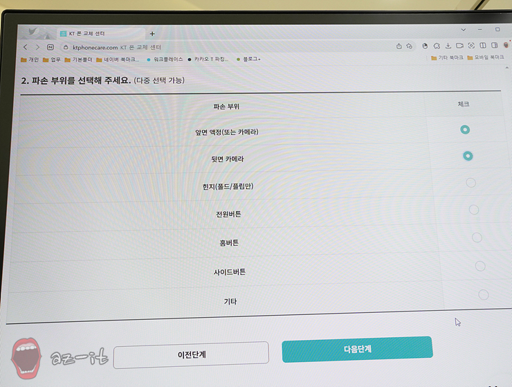 신청 전 유의사항을 모두 확인하면 어느 부위가 파손되었는지 체크를 진행하게 됩니다. 앞면 액정(또는 카메라), 뒷면 카메라, 힌지, 전원버튼, 홈버튼, 사이드 버튼 그 외 부위로 구성되어 있고 하나 이상 선택도 가능한데요, 저처럼 심각한 파손이 아니더라도 AS를 받아야 하는 상태라면 직접 AS센터에 가지 않고 클릭만으로 서비스를 받을 수 있으니 안 할 이유가 없는 것 같습니다.