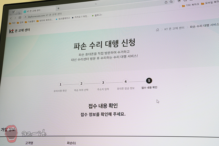 파손 대행 서비스를 신청하기 위한 정보를 모두 입력한 마지막 단계는 접수 내용을 확인하는 내용입니다. 가입정보부터 파손된 부위, 수거지와 배송지까지 기재한 모든 내용이 맞는지 확인하면 비로소 접수가 완료됩니다.