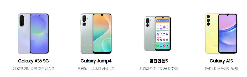 갤럭시 S25 시리즈, 갤럭시Z 시리즈, 갤럭시 A36, A15, Jump4 등 플래그십 모델부터 가성비 좋은 모델까지 예산, 용도, 성능 기준에 따라 선택 폭이 상당히 넓다는 점이 인상적입니다.