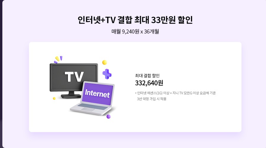 인터넷과 TV 결합으로 가입시 최대 33만원 할인 혜택도 받을 수 있고요.