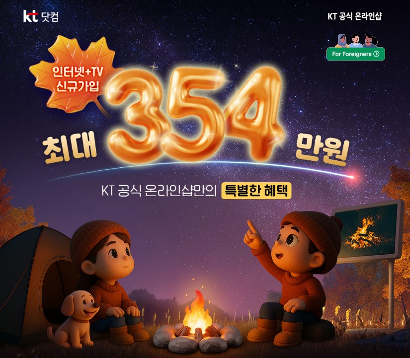 집에서 OTT·TV 시청이 많은 가구나 KT 휴대폰 사용자가 이미 있는 경우, 신규 입주/이사로 인터넷·TV를 함께 가입해야 하는 경우, 상품권 또는 가전 사은품을 받고 싶은 분이라면 이번 기회에 KT 인터넷 + TV 동시 신규가입 시 최대 354 만원 규모 혜택을 받아 보시기 바랍니다.