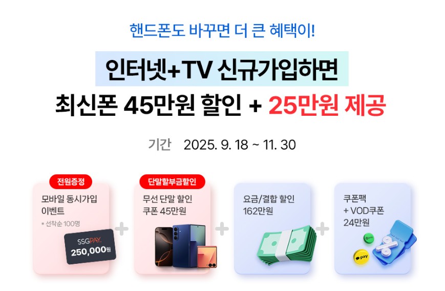 사은품 최대 45만원, 매월 이용요금 할인 제공, 인터넷 + TV 결합 할인, 핸드폰 결합 할인 (가구 내 KT 휴대폰 결합 시), 제휴카드 사용 시 추가 할인 등 조건에 따라 혜택 규모는 달라질 수 있지만, 휴대폰 결합과 제휴카드까지 함께 이용하면 총 할인 금액이 상당히 커지는 구조입니다.