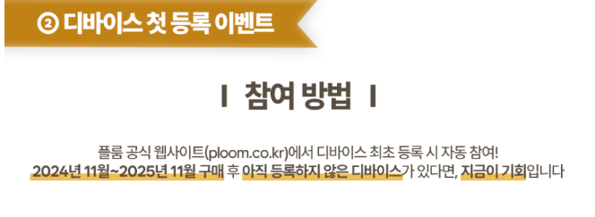 플룸 공식 웹사이트(ploohttp://m.co.kr)에서 등록하고 디바이스 첫 등록 완료 표시 확인하면 자동으로 이벤트 참여가 완료됩니다.