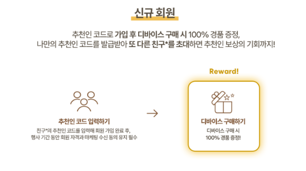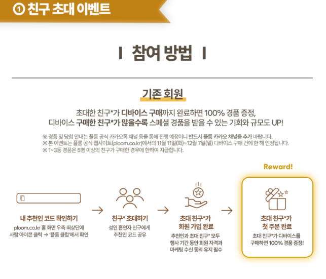 신규회원의 경우 초대한 친구의 추천인 코드를 입력해 회원가입을 완료한 후 행사 기간 동안 회원 자격과 마케팅 수신 동의 유지를 필수로 진행하고 플룸 디바이스를 구매하면 100% 선물이 지급됩니다. 여기에 나만이 추천인 코드를 발급받아 또 다른 친구를 초대하면 추가 경품 기회까지 얻을 수 있습니다.