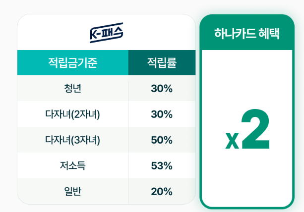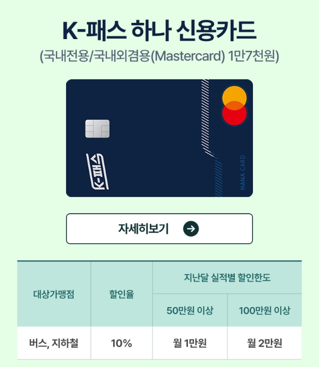 K-패스 요금제를 이용하기 위해선 하나카드 K-패스 카드(신용/체크) 이용이 필수입니다. 각 카드마다 지난달 실적에 따라 할인 받을 수 있는 비용이 다르지만 매월 최대 1만원의 추가 환급이 가능하기 때문에 통신비와 교통비 절감효과가 상당합니다. 카드도 본인의 소비 스타일이나 활용도에 따라 선택해 K-패스 요금제와 결합해 이용할 수 있습니다.