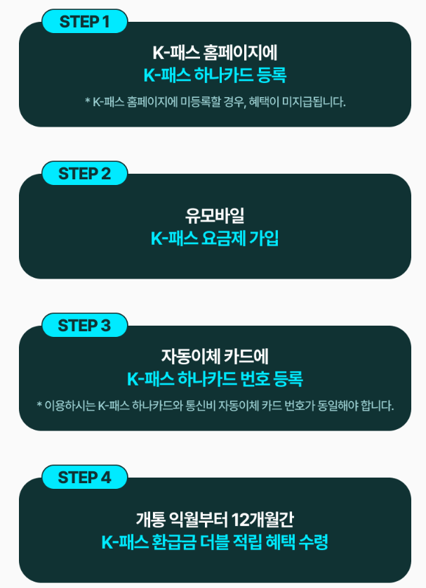 교통비를 더블 적립하는 방법도 간단합니다. 먼저 K-패스 홈페이지에서 하나카드 등록를 등록하고 내게 꼭 맞는 유모바일 K-패스 요금제에 가입합니다. 이후 자동이체 카드에 하나카드 번호 등록해야 하는데요 이때 카드와 통신비 자동이체 카드 번호가 동일해야만 혜택을 받을 수 있습니다.