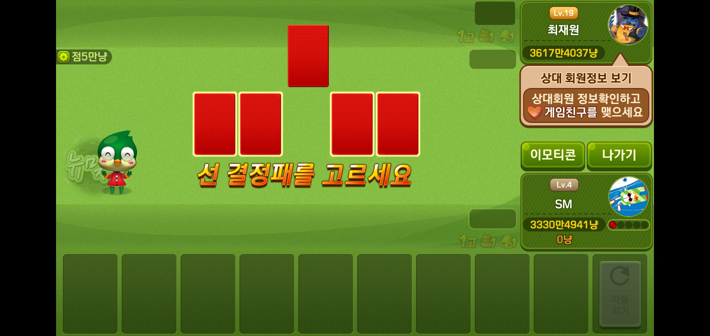 점5만냥 방을 선택하고 시작되는 경기는 왠지 모를 긴장감이 느껴지는데요, 선을 잡아야만 바닥에 깔린 조커를 가지고 올 수 있기 때문에 신중을 기하는 순간이기도 합니다.