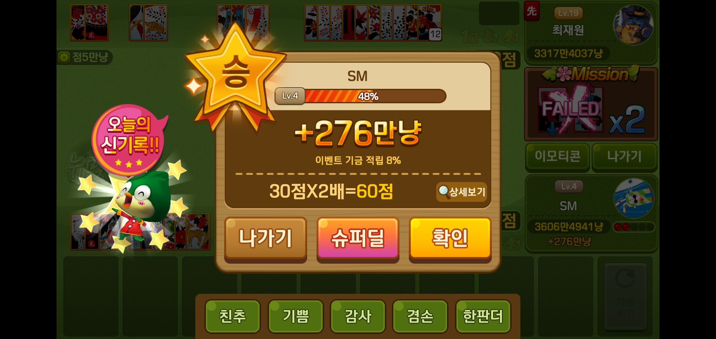 선이었던 상대였지만 3점이라는 점수를 내는데 그친 상대유저는 한숨이 절로 나오지 않았을까 합니다. 반대로 큰 점수를 내어 두둑한 점수를 만들고 신기록까지 세워서 기분 좋은 전 감사인사를 잊지 않았습니다. 슈퍼딜로 다음 판을 더욱 크게 할 수도 있지만 우선은 여기에서 만족하는 걸로!!