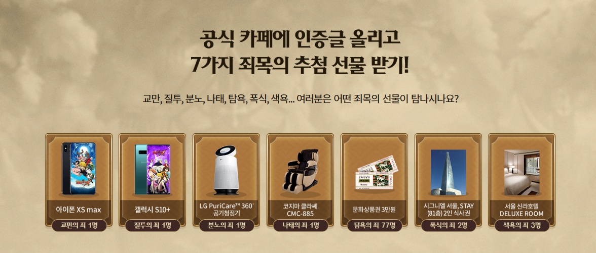 공식카페에 인증글을 올리면 획득 가능한 선물도 준비되어 있습니다. 교만, 질투, 분노, 나태, 탐욕, 폭식, 색욕 총 7가지 죄목 중에서 하나를 선택 도전 할 수 있는데요, 죄목에 따라 주어지는 선물이 달라 탐나는 아이템을 선택 그에 따른 인증글을 올려도 좋을 것 같습니다.