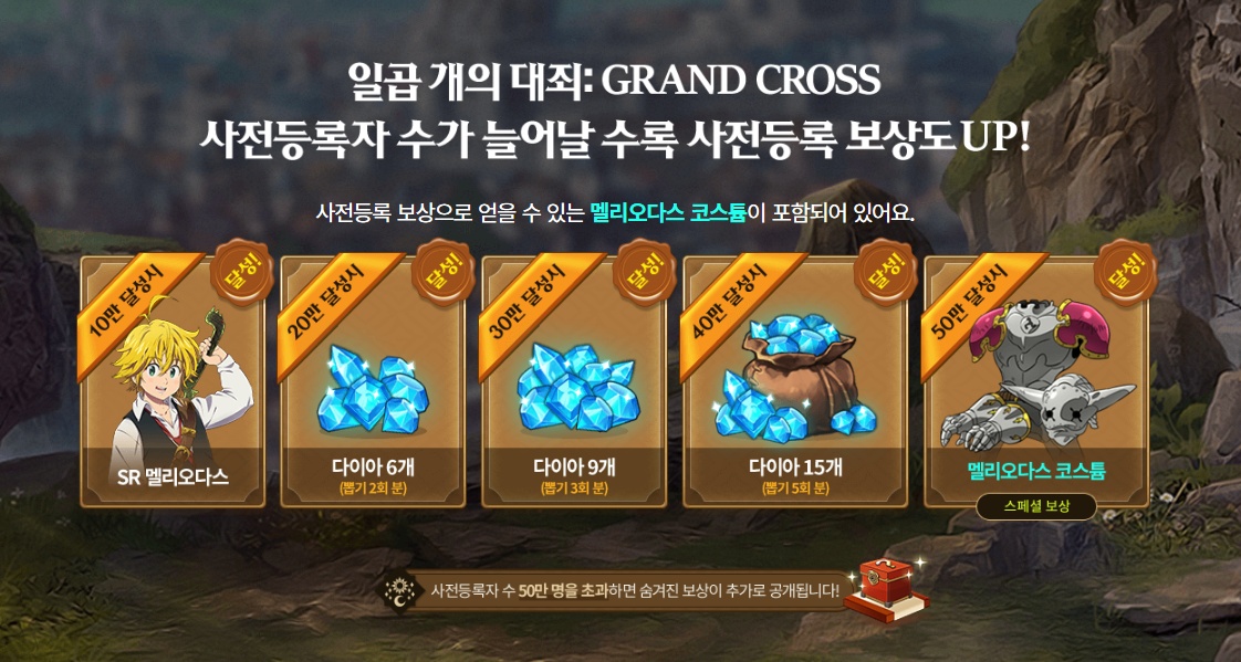 사전등록을 꼭 해야하는 이유 바로 보상입니다. 시작과 동시에 목표로 삼았던 인원에 따른 보상의 경우 이미 모든 숫자를 달성한 상태인데요, 50만명 초가시 숨겨진 보상인 멜리오다스 코스튬도 공개된 상태로 사전등록에 참여하면 다이아부터 SR멜리오다스와 코스튬까지 모두 받을 수 있습니다.
