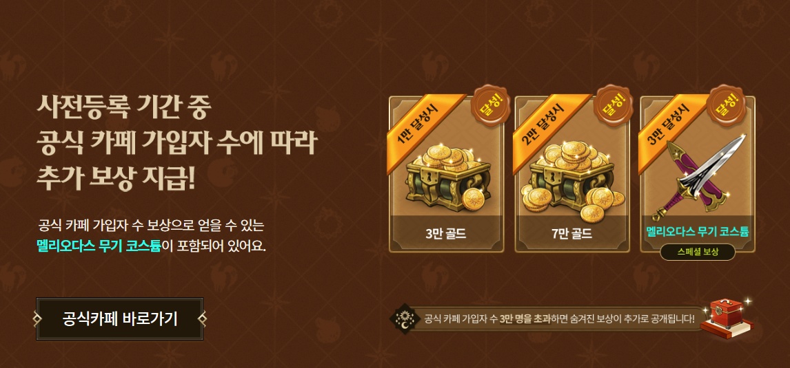 공식카페 가입자 수에 따른 추가 보상도 지급됩니다. 가입자 수에 따른 이벤트 역시 3만을 달성하면 그에 따른 스페셜 보상이 주어지는데요, 이 역시 이미 달성 인원을 넘어선 상태로 카페 가입만 하면 모든 선물을 받을 수 있습니다. 사전등록에 공식카페 선물까지 더해지면 SR멜리오다스와 의상 및 무기 코스튬은 그냥 가지고 시작하게 됩니다.
