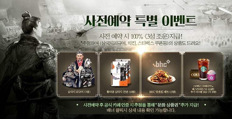 사전예약에 참여한 인원 중 추첨을 통해 삼국지 피규어부터 황석영 삼국지 전권 그리고 BHC 맛초킹과 스타벅스 아메리카노등 다양한 선물이 준비되어 있습니다. 뿐만 아니라 공식카페 인증에 참여하면 문화상품권 선물도 추가로 받을 수 있습니다.