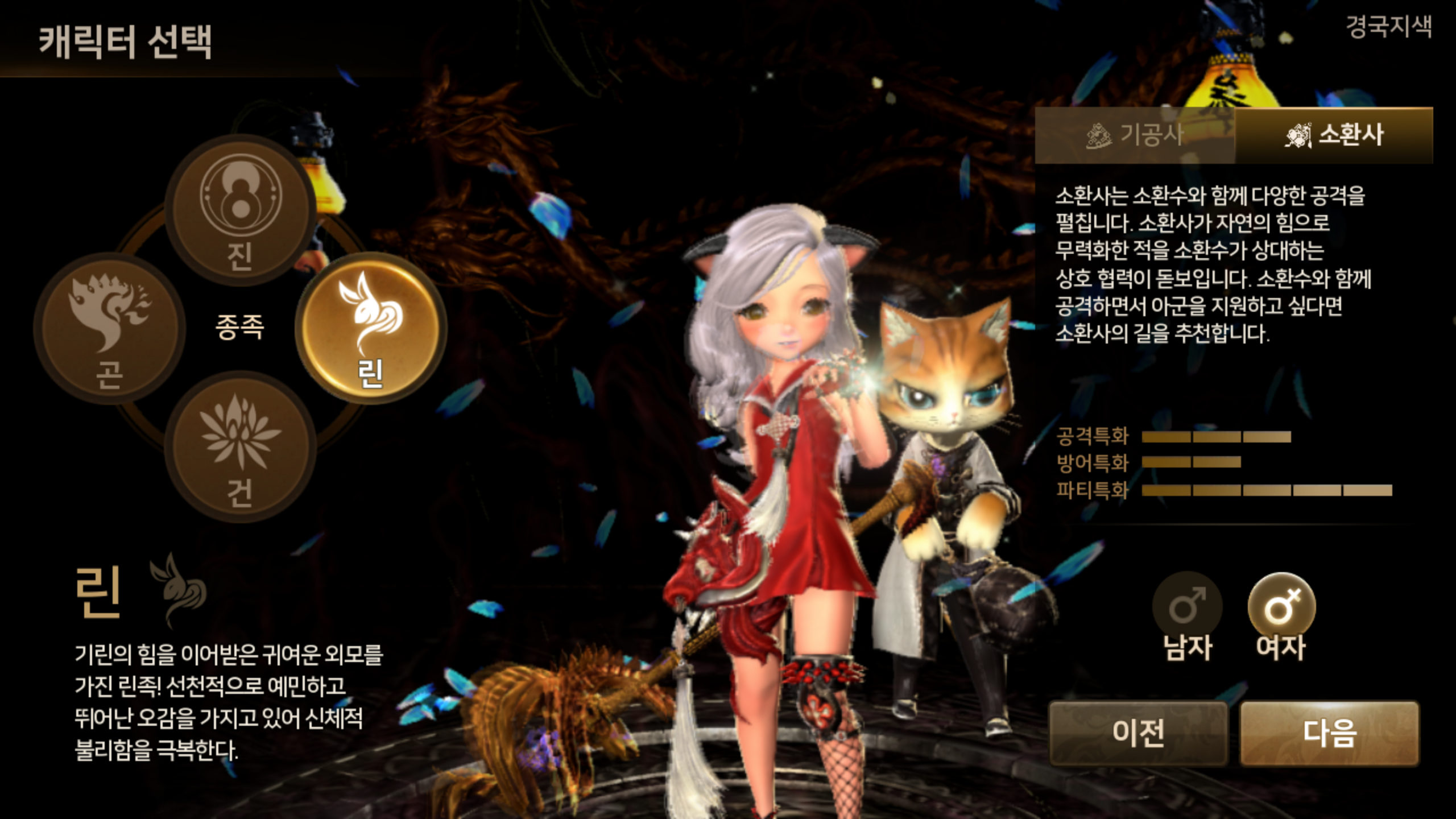 소환사는 린종족으로 플레이가 가능합니다. 소환사를 선택하면 다른 직업과는 다르게 고양이 한마리가 뒤에 서 있는 모습을 확인할 수 있습니다. 그냥 서있다고 하기엔 존재감이 상당한데요, 화면에서 보이는 고양이는 소환사의 소환수가 되어 맹활약을 펼치는 중요한 역할을 하게 됩니다.