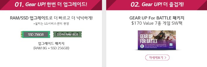 LG울트라기어 17 예약판매에 참여하면 주어지는 혜택도 상당합니다. 우선 RAM/SSD 업그레이드가 제공되는데요 SSD 256GB, DDR4 RAM 8GB 업그레이드 패키지 제공하여 보다 빠르고 넉넉한 사용이 가능합니다. 또한 'GEAR UP For BATTLE 패키지’ 제공 $170 Value 7종 게임 SW팩을 받을 수 있습니다.