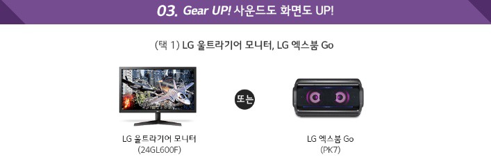 LG 울트라기어 모니터(24GL600F)와 LG 엑스붐 Go(PK7) 중 원하는 제품 한가지를 제공합니다. 어떤 것을 선택하든 후회하지 않을 선택이라고 이야기 해도 부족함이 없는 선물이 아닐까 싶습니다.