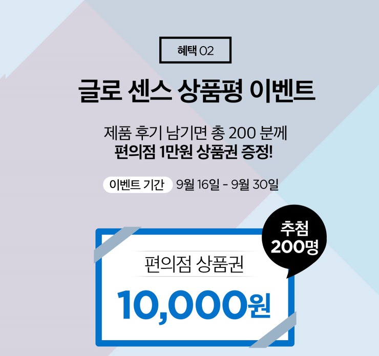 글로센스 제품 후기 이벤트도 함께 진행 중입니다. 9월 30일까지 제품 후기를 남긴 분들 중 추첨을 통해 편의점상품권 1만원권을 200명에게 증정합니다. 40% 할인을 받아 구입해 상품평 이벤트까지 모든 혜택을 받는다면 실로 상당히 남는 장사라고 할 수 있을 정도로 혜택이 어마어마 합니다.