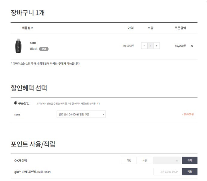 글로센스 구매는 글로 홈페이지를 통해 가능합니다. 소비자가와 쿠폰할인가 동시에 확인되어 구매 금액을 빠르게 확인할 수 있는데요, 키트당 최대 5개까지 할인을 받을 수 있습니다.