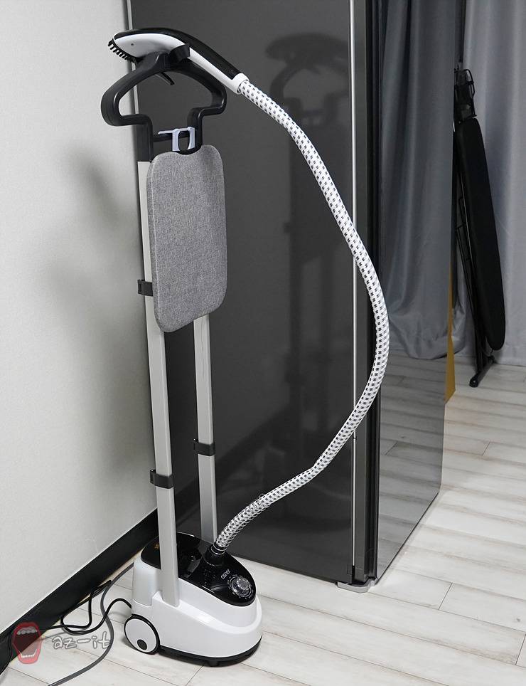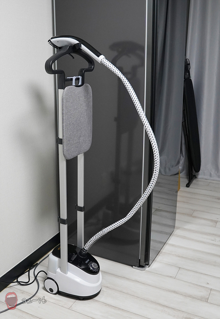 각각으로 나누어진 구성품을 조립하면 눈높이 보다 조금 낮은 스탠드형 스팀다리미를 만날 수 있습니다. 다림질도 좋지만 블랙과 화이트 색상으로 구성된 디자인은 집안 어느 곳에 두어도 눈에 띄지 않을 정도로 잘 어우러지는 점도 놓치면 안되는 포인트라고 할까요?
