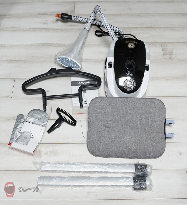 오스너 아이프론 스탠드형 스팀다리미는 직접 본체를 포함한 구성품을 이용해 조립을 한 후 사용할 수 있도록 배송되었습니다. 구성품의 경우에도 물을 넣는 본체와 다림판 그리고 뜨거운 스팀을 막아줄 장갑등 알찬 구성으로 준비되어 있습니다. 조립도 그리 어렵지 않아 누구나 쉽게 가능합니다.