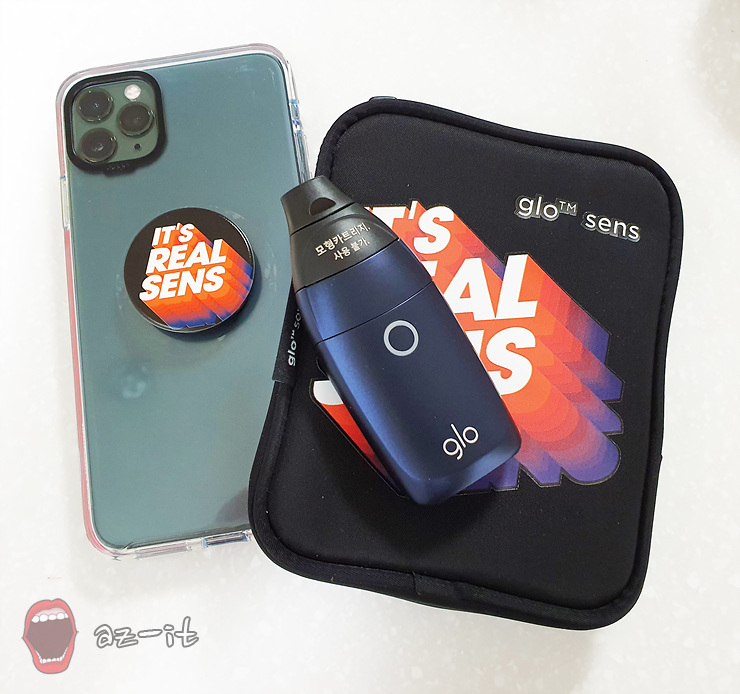 센스박스 속 작은 상자에는 글로센스와 액상포트 수납이 가능한 파우치가 들어있었습니다. 파우치 역시 스마트폰 홀더와 같은 디자인으로 구성되어 있어 부담스럽지 않고 수납과 휴대가 용이해 편리해 보였습니다.