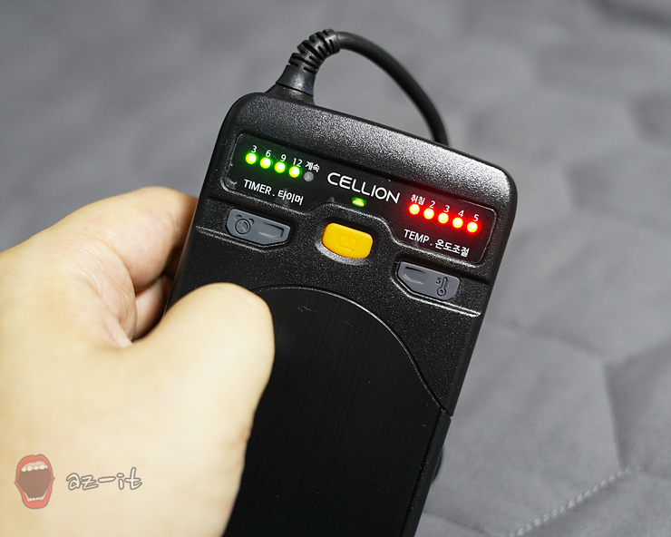 컨트롤러의 경우 가운데 버튼을 누르변 전원을 on/off 할 수 있습니다. 양쪽으로 녹색과 붉은색의 알람등의 경우 왼쪽은 타이머 등으로 정해진 시간만 사용이 가능합니다. 오른쪽 붉은색 등은 5단계로 나뉘어진 온도를 원하는 단계에 놓고 사용 가능하도록 되어 있습니다.