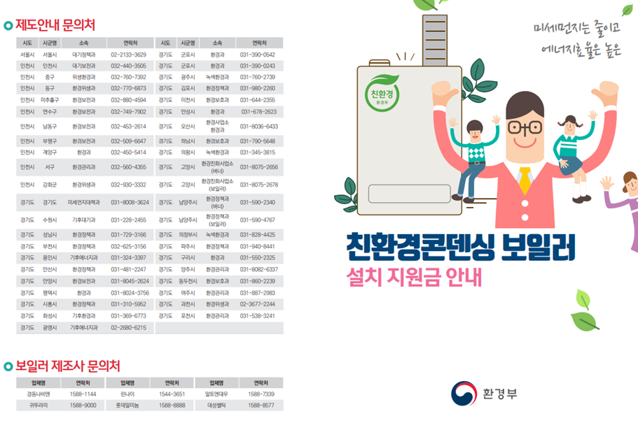 2020년이면 콘덴싱 의무화가 진행되는 만큼 빠르게 움직여 설치지원금을 받으면서 교체할 필요가 있는데요, 친환경콘덴싱보일러 설치지원금 관련하여 상세한 내용 및 궁금한 사항들은 각 시군구 담당부처에서 보다 자세한 내용을 확인할 수 있습니다.