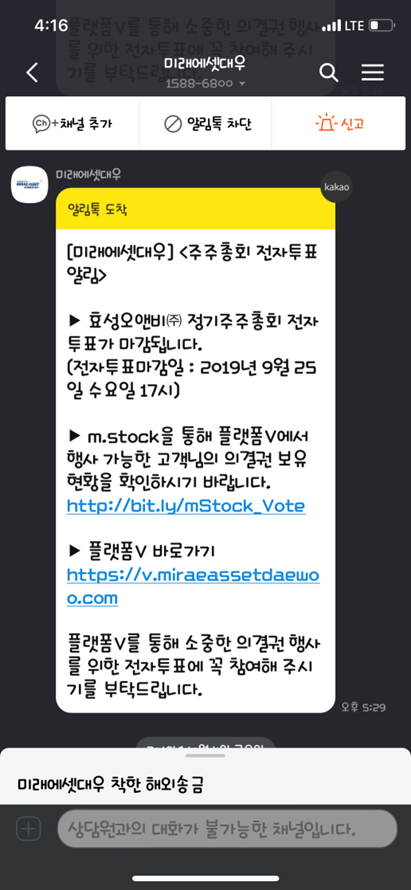 보유한 종목에 따라 전자투표가 진행되면 상기 문자를 통해 진행 여부 확인이 가능합니다. 미래에셋대우 전자투표 플랫폼V는 PC와 모바일 모두 접속 가능한 만큼 소중한 의결권 행사 이젠 시간과 장소 구애 없이 전자투표를 통해 꼭 참여해보시기 바랍니다.