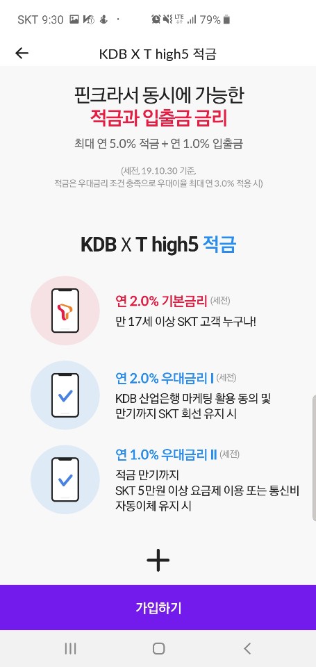 핀트 T high5 적금의 경우 만 17세 이상 SKT고객이라면 가입 할 수 있습니다. 연 2.0% 기본금리를 바탕으로 KDE산업은행 마케팅 활용 동의 및 만기까지 SKT회선을 유지하면 2% 추가 우대금리를 받을 수 있습니다. 여기에 또 하나! 적금 만기까지 SKT5만원이상 요금제 이용 또는 통신비 자동이체를 유지하면 연 1% 우대금리가 적용됩니다.