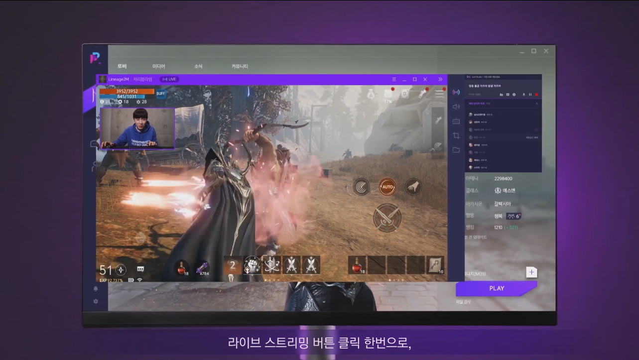퍼플의 경우 스트리밍 기능을 통해 혈맹원의 화면을 직접 보면서 함께 소통하는 것도 가능합니다. 퍼플 존에서 스트리밍 버튼만 클릭하면 간단한 방송설정도 가능해 쉽고 빠르게 라이브 방송이 시작되는데요, 혈맹원들의 경우 실시간 방송되고 있는 화면을 보면서 라이브채팅도 즐길 수 있습니다.