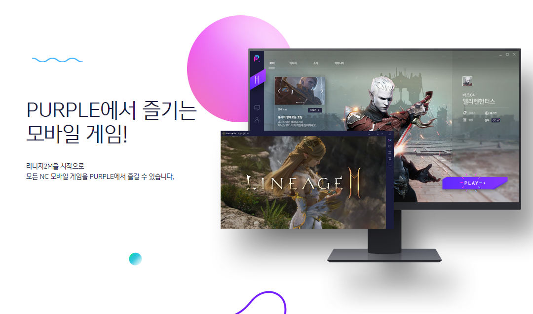 퍼플은 게임을 이용하는 사용자의 입장에서 언제 어디서나 게임을 플레이 할 수 있고 소통할 수 있도록 구성된 게이밍 플랫폼입니다. 디바이스와 플랫폼 제약 없는 크로스 플레이를 지향하는데요, 모든 NC모바일게임을 PC에서 완벽하게 즐길 수 있고 PC환경에 최적화된 그래픽 품질과 성능을 즐길 수 있는 것이 특징입니다.