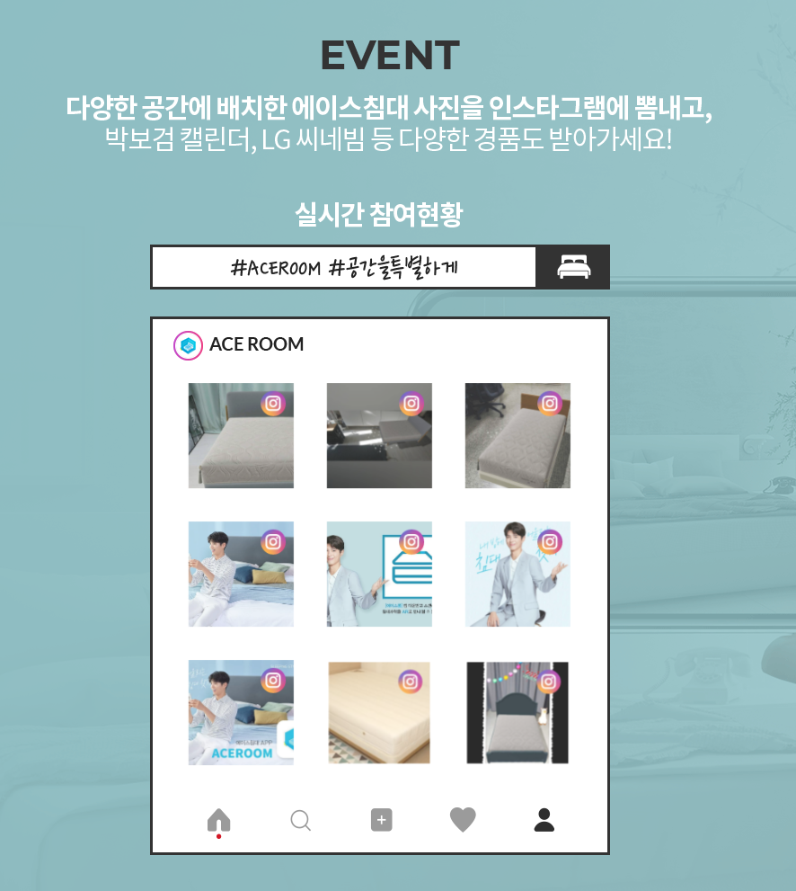 집안 공간을 보다 손쉽게 어플 하나로 완성해 볼수 있는 에이스룸 런칭 기념 풍성한 이벤트도 진행 중입니다. 다양한 공간에 배치한 에이스침대 사진을 인스타그램에 뽐내면 박보검 캘린더를 비롯해 LG씨네빔등 어마어마한 선물을 받을 수 있습니다.