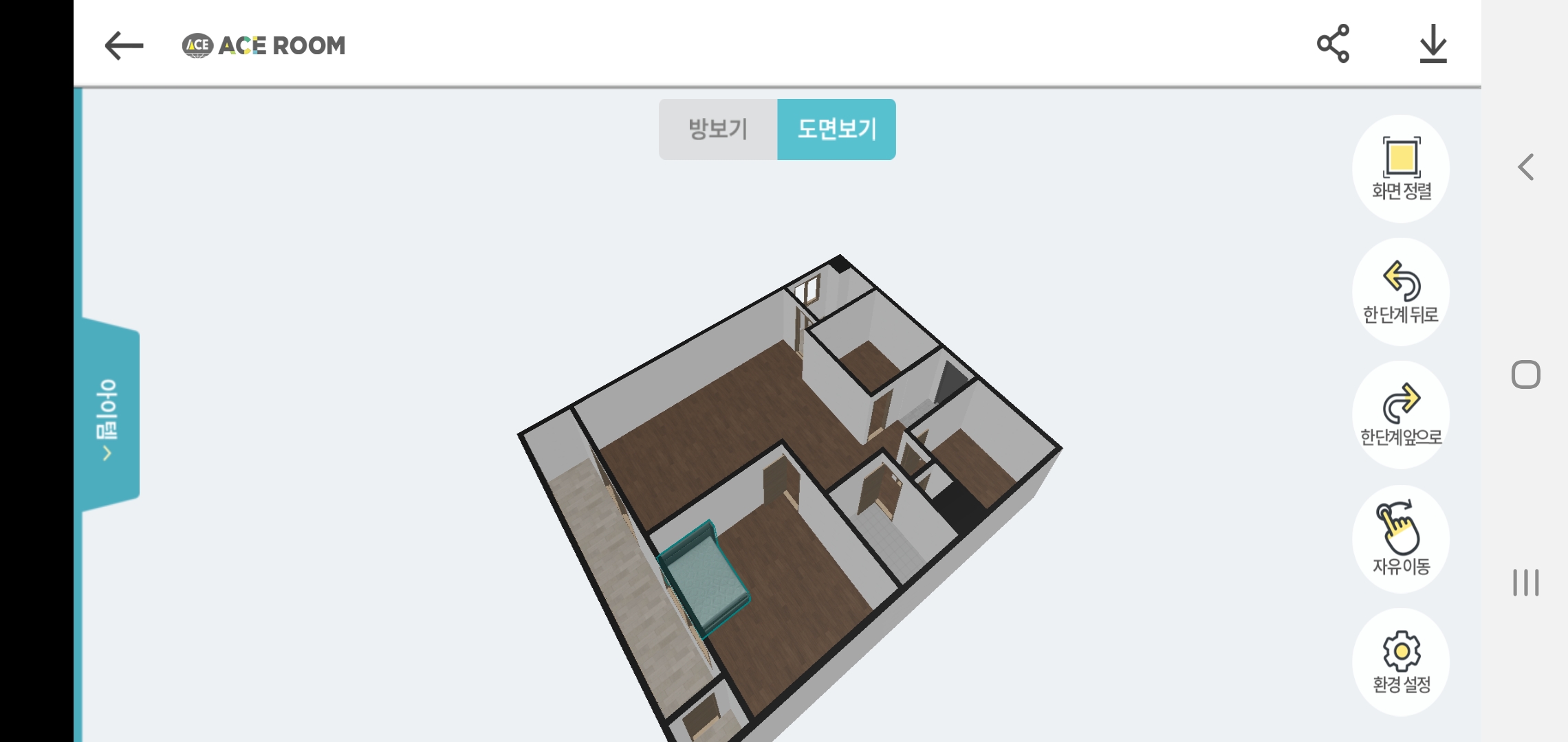 도면을 확인한 후 아이템 버튼을 눌러 준비된 침대와 벽지 그리고 바닥재를 확인해보았습니다. 우선 침대부터 선택해보았는데요, 에이스에서 구매 가능한 제품들이 다양하게 준비되어 있는데다 사이즈 선택도 가능해 다양한 사이즈로 침대를 설치해 볼 수 있었습니다.