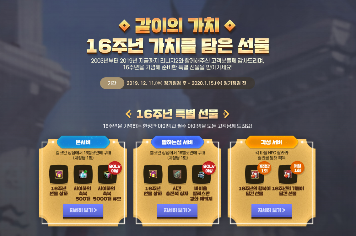 16주년을 맞이해 진행된 펫업데이트 외에도 같이의 가치를 담은 선물 이벤트도 진행 중입니다. 1월 15일까지 진행되는 이번 이벤트는 본서버와 말하는섬서버 그리고 각성 서버별 다른 선물이 주어져 레벨업을 하는데 여러모로 많은 도움을 받을 수 있을 것 같습니다.