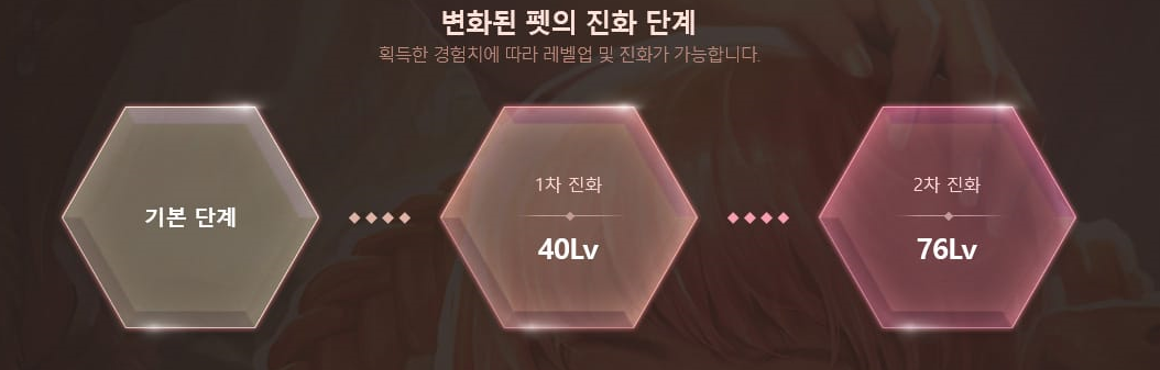 변화된 펫은 획득한 경험치에 따른 레벨업과 진화가 가능합니다. 기본단계부터 시작해 40레벨이 되면 1차 진화를 하게 되고, 76레벨이 되면 2차 진화를 하게 됩니다. 펫은 레벨에 따른 기본 능력치가 상승하고 진화를 통해 고유 능력이 크게 상승하게 되는데요, 진화 여부에 따라 펫 전투 능력에 큰 차리를 가지고 있는 점이 특징입니다.