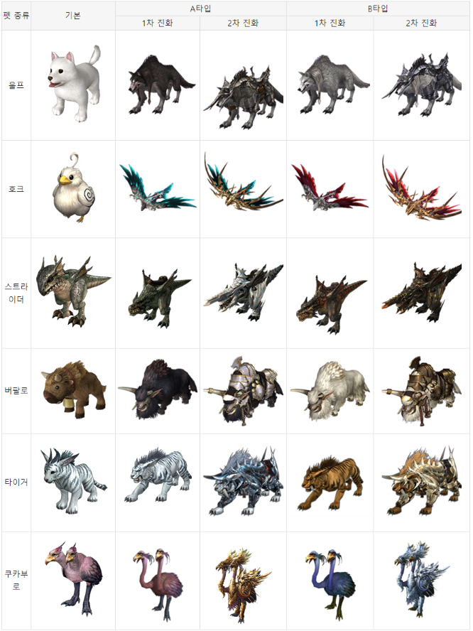 펫 종류에 따른 진화 단계별 외형도 확인 가능합니다. 펫의 경우 1차 진화에서 외형 업그레이드가 진행되는데요, 신규 스킬 습득하고, 펫의 이름과 스탯이 랜덤하게 부여됩니다. 이름과 스탯은 변경할 수 없기 때문에 마음에 드는 이름과 스탯이 붙도록 운을 기대해야 하는 재미도 있을 것 같습니다. 2차 진화에서는 더욱 강력한 스킬을 획득하게 되는데요, 외형 역시 갑주를 두른 형태로 더욱 강인한 모습으로 진화하게 됩니다.