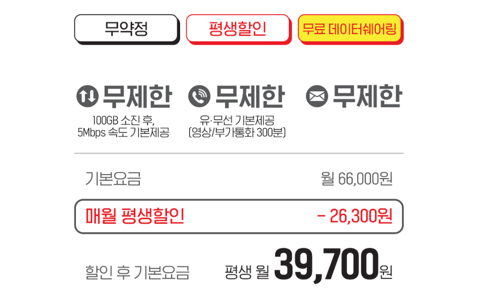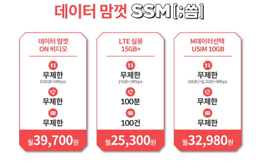 데이터를 많이 사용하는 분들의 경우 데이터 맘껏 씀 요금제가 보다 합리적인데요, 데이터를 맘껏 쓰고 통화 및 문자까지 무제한인 데이터 맘껏 ON 비디오 요금제가 39,700원으로 활용할 수 있습니다. 또한 우러 사용양에 따라 선택 가능한 요금제를 통해 보다 합리적인 비용을 선택할 수 있는 점은 기본이고 말이죠.